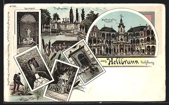 Lithographie Hellbrunn, Mechanisches Theater, Vogelsang-Grotte, Tischgrotte