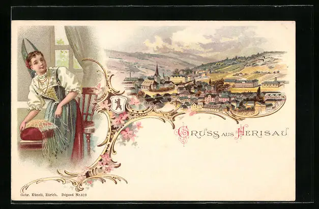 Lithographie Herisau, Ortsansicht aus der Vogelschau