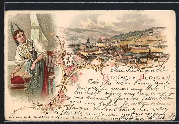 Lithographie Herisau, Panorama. Frau beim Klöppeln