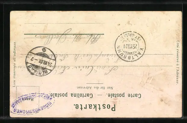 Personenbezogene Daten auf der Rückseite der Karte wurden durch blauen Textmarker unkenntlich gemacht. Die blauen Stellen sind auf die Vorderseite durchgeweicht und wirken sich negativ auf das Postkartenfoto aus