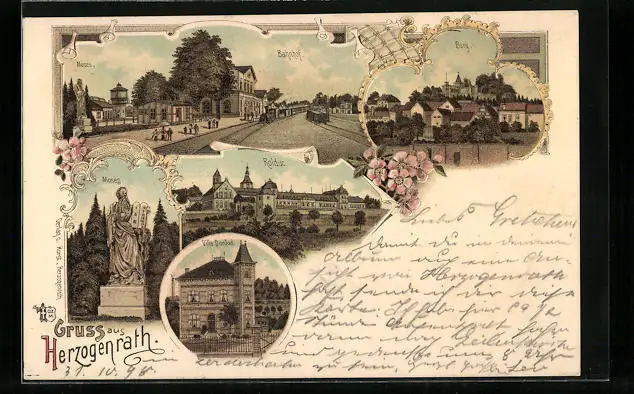 Lithographie Herzogenrath, Villa Dunkel, Bahnhof, Moses, Burg