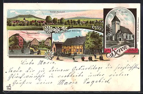 Lithographie Heyen b. Halle i. Br., Gasthaus von Wilh. Pieper, Strassenpartie