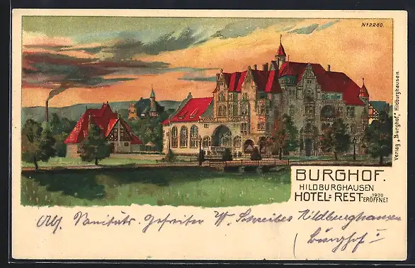 Lithographie Hildburghausen, Burghof Hotel-Restaurant 1900 eröffnet