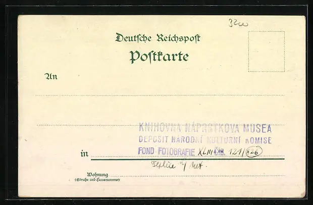 Personenbezogene Daten auf der Rückseite der Karte wurden durch blauen Textmarker unkenntlich gemacht. Die blauen Stellen sind auf die Vorderseite durchgeweicht und wirken sich negativ auf das Postkartenfoto aus