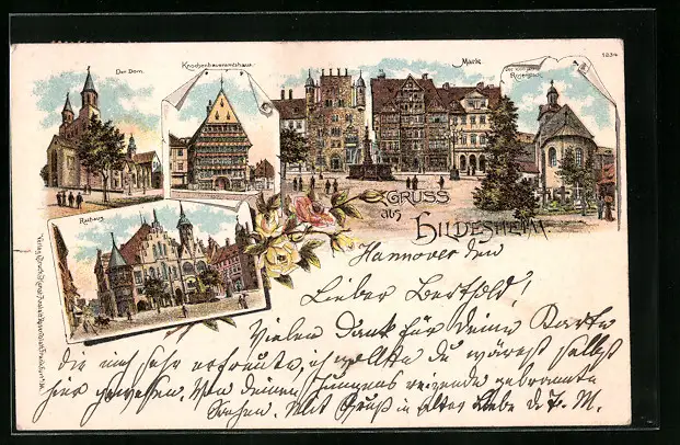 Lithographie Hildesheim, Markt, Rathaus, Dom