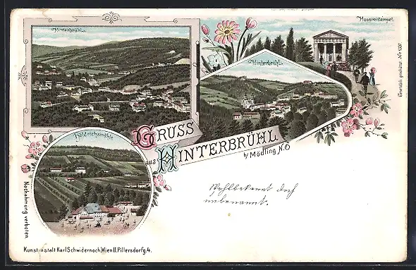 Lithographie Hinterbrühl b. Mödling, Gasthaus Höldrichsmühle, Husarentempel