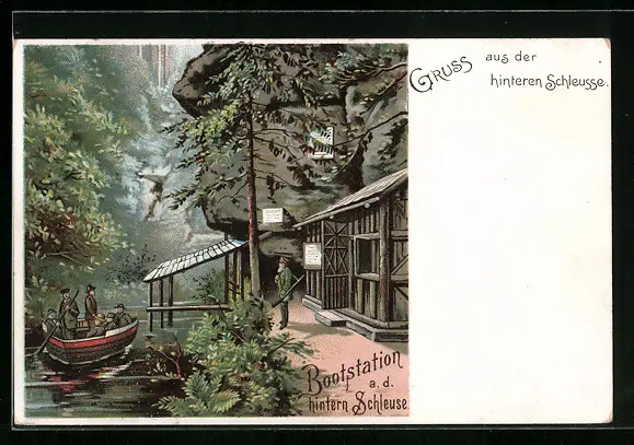 Lithographie Hinterhermsdorf /Sächs. Schweiz, Bootstation an der hinteren Schleuse