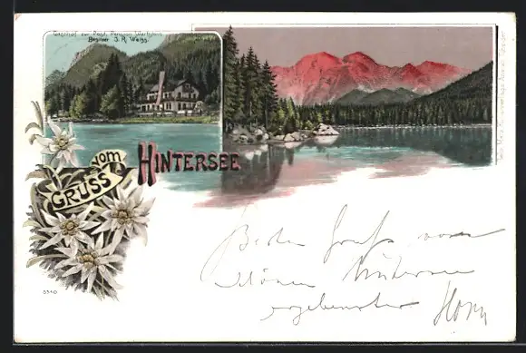 Lithographie Hintersee, Gasthof zur Post & Pension Wartstein, Uferpartie