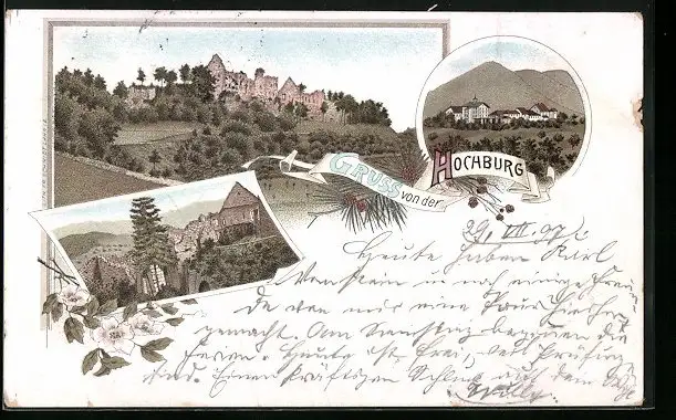 Lithographie Hochburg, Ortsansicht, Ruine