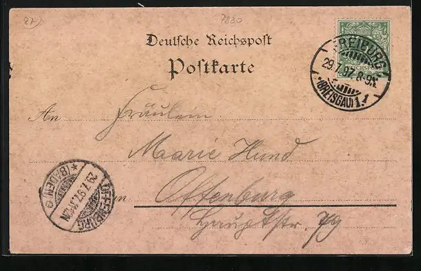 gelaufen 1897, Eckknick u. Einriss re. oben, guter Zustand