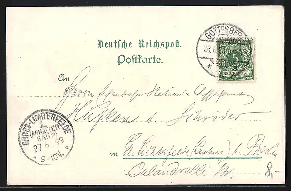 Personenbezogene Daten auf der Rückseite der Karte wurden durch blauen Textmarker unkenntlich gemacht. Die blauen Stellen sind auf die Vorderseite durchgeweicht und wirken sich negativ auf das Postkartenfoto aus