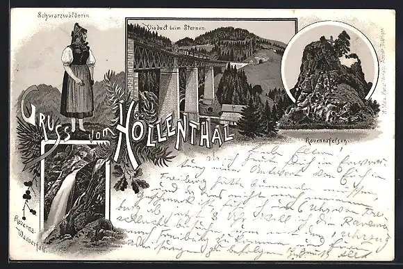 Lithographie Höllenthal / bad. Schwarzwald, Viadukt beim Sternen, Ravennafelsen, Schwarzwälderin in Tracht