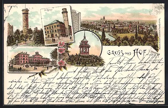 Lithographie Hof, Labyrinth, Rathaus, Post, Thomashöhe