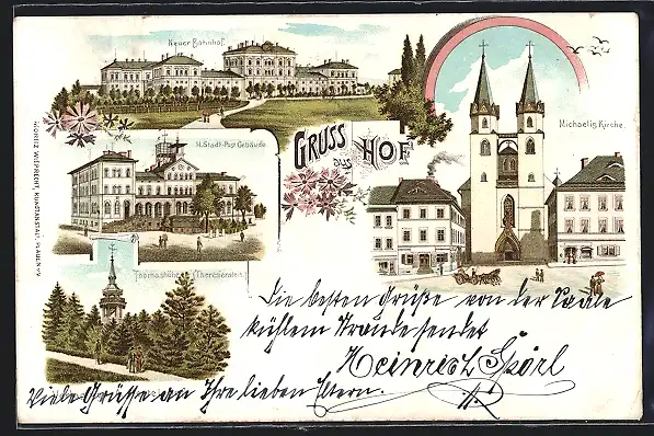 Lithographie Hof, Neuer Bahnhof, Post-Gebäude, Michaelis-Kirche & Thomashöhe