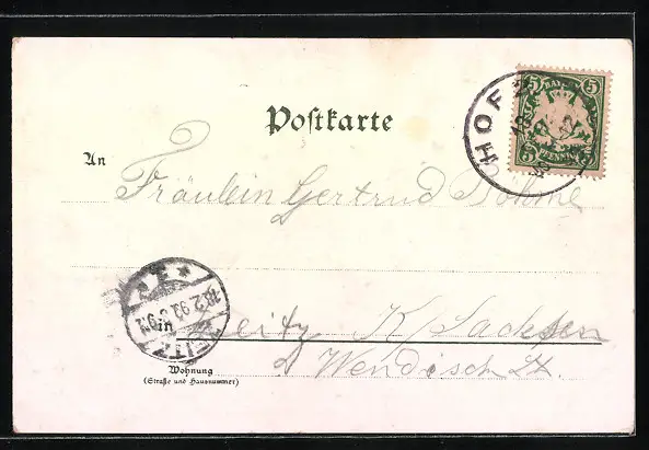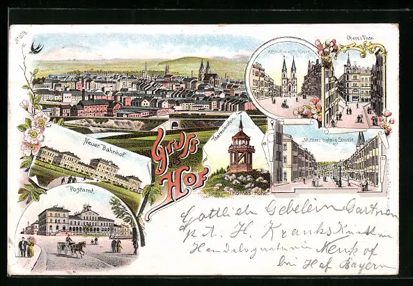 Lithographie Hof, Neuer Bahnhof, Postamt, Oberes Tor