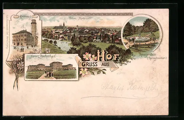 Lithographie Hof, Neuer Bahnhof, Rathaus, Theresienstein