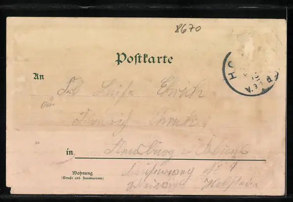 Personenbezogene Daten auf der Rückseite der Karte wurden durch blauen Textmarker unkenntlich gemacht. Die blauen Stellen sind auf die Vorderseite durchgeweicht und wirken sich negativ auf das Postkartenfoto aus