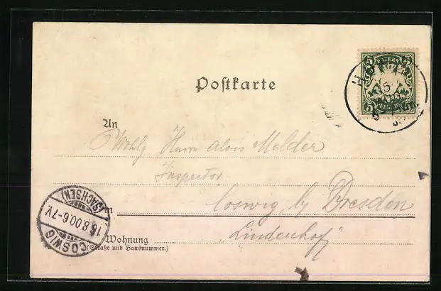 Personenbezogene Daten auf der Rückseite der Karte wurden durch blauen Textmarker unkenntlich gemacht. Die blauen Stellen sind auf die Vorderseite durchgeweicht und wirken sich negativ auf das Postkartenfoto aus