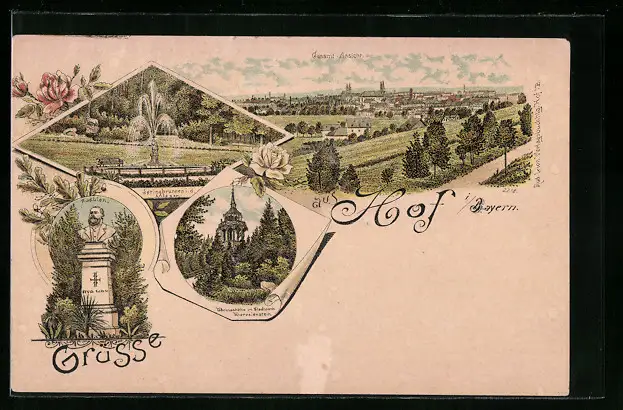 Lithographie Hof i. Bayern, Gesamtansicht, Thomashöhe im Stadtpark