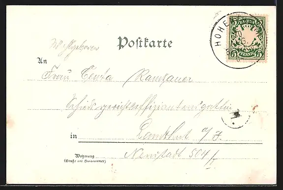 Personenbezogene Daten auf der Rückseite der Karte wurden durch blauen Textmarker unkenntlich gemacht. Die blauen Stellen sind auf die Vorderseite durchgeweicht und wirken sich negativ auf das Postkartenfoto aus