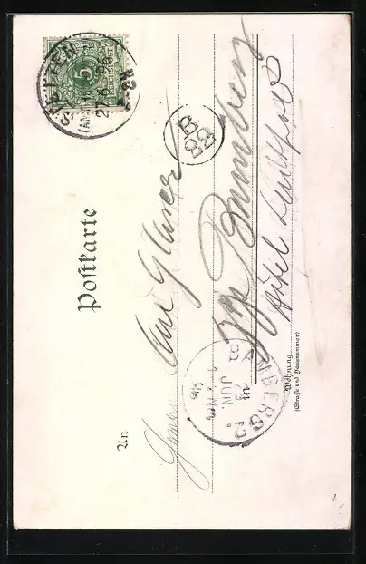 Personenbezogene Daten auf der Rückseite der Karte wurden durch blauen Textmarker unkenntlich gemacht. Die blauen Stellen sind auf die Vorderseite durchgeweicht und wirken sich negativ auf das Postkartenfoto aus