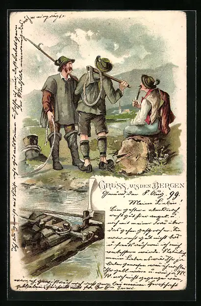 Lithographie Holzfäller im Gespräch, Floss