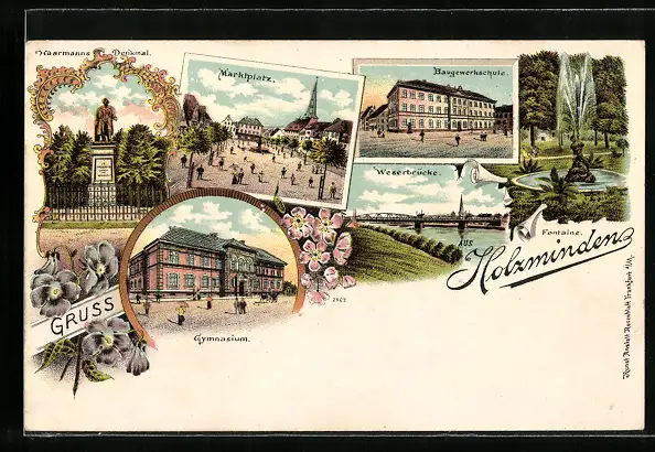 Lithographie Holzminden, Fontaine, Weserbrücke, Marktplatz, Gymnasium