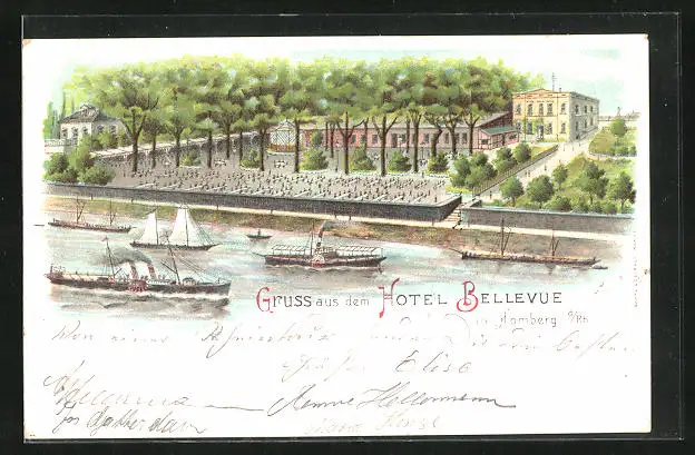 Lithographie Homberg / Rhein, Hotel Bellevue, Rheindampfer
