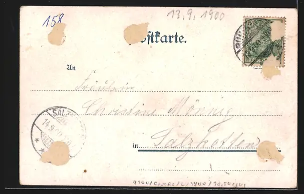 gelaufen 1900, rückseitig Oberflächenschaden, guter Zustand