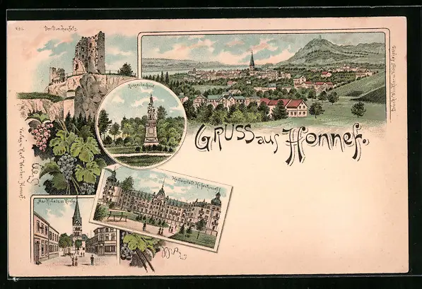 Lithographie Honnef /Rh., Gesamtansicht, Drachenfels, Heilanstalt Hohenhonnef