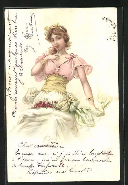 Lithographie Hübsche junge Dame mit Kirschen auf dem Schoss, Jugendstil