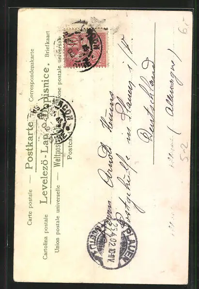 Personenbezogene Daten auf der Rückseite der Karte wurden durch blauen Textmarker unkenntlich gemacht. Die blauen Stellen sind auf die Vorderseite durchgeweicht und wirken sich negativ auf das Postkartenfoto aus
