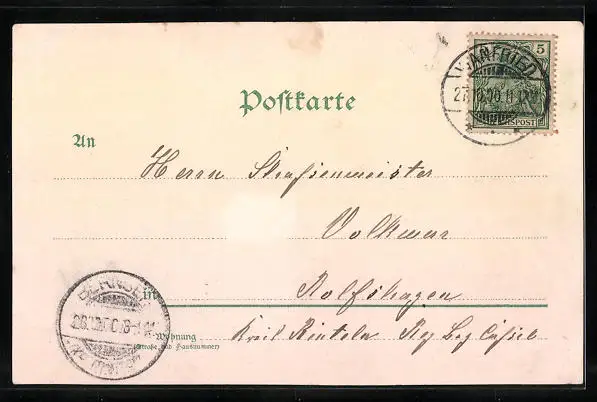 Personenbezogene Daten auf der Rückseite der Karte wurden durch blauen Textmarker unkenntlich gemacht. Die blauen Stellen sind auf die Vorderseite durchgeweicht und wirken sich negativ auf das Postkartenfoto aus