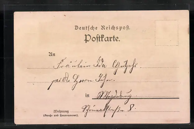 Personenbezogene Daten auf der Rückseite der Karte wurden durch blauen Textmarker unkenntlich gemacht. Die blauen Stellen sind auf die Vorderseite durchgeweicht und wirken sich negativ auf das Postkartenfoto aus