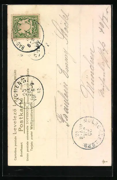 Personenbezogene Daten auf der Rückseite der Karte wurden durch blauen Textmarker unkenntlich gemacht. Die blauen Stellen sind auf die Vorderseite durchgeweicht und wirken sich negativ auf das Postkartenfoto aus