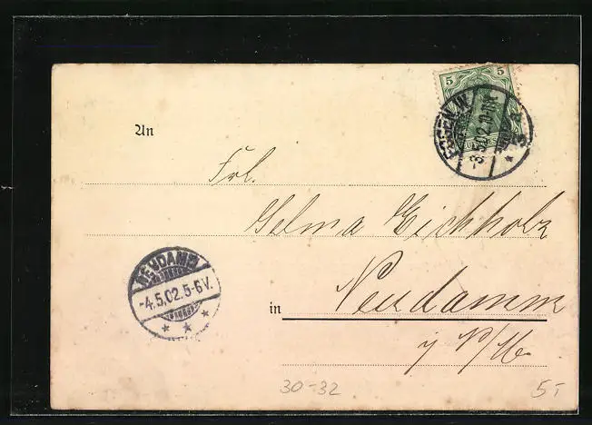 Personenbezogene Daten auf der Rückseite der Karte wurden durch blauen Textmarker unkenntlich gemacht. Die blauen Stellen sind auf die Vorderseite durchgeweicht und wirken sich negativ auf das Postkartenfoto aus