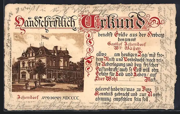 Lithographie Ichendorf / Köln, Gasthof, Inh. Ww. Bayer, Urkunde