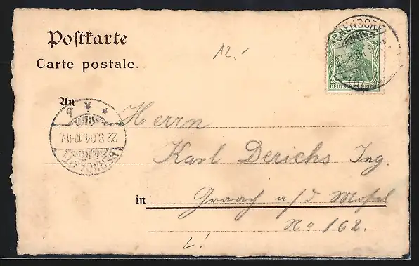 gelaufen 1904, Eckknick li. unten, guter Zustand