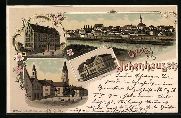 Lithographie Ichenhausen, Schule, Kirche mit Rathaus, Krankenhaus, Totalansicht