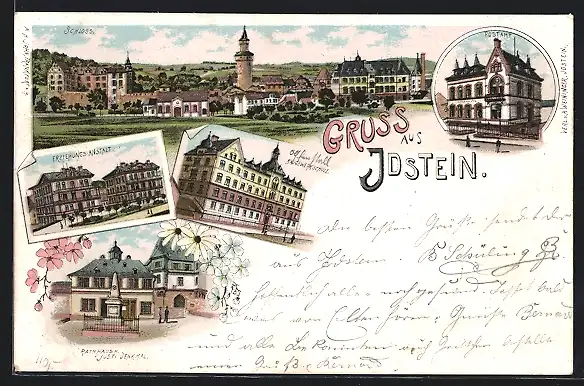 Lithographie Idstein, Rathaus mit Denkmal, Erziehungs-Anstalt, Baugewerkschule
