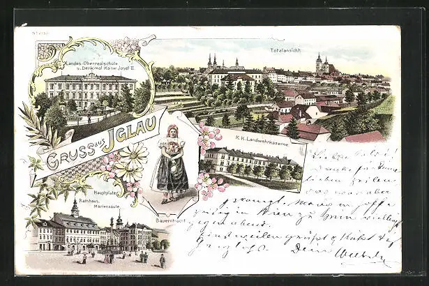 Lithographie Iglau, Totalansicht, Landes-Oberrealschule und Denkmal Kaiser Josef II