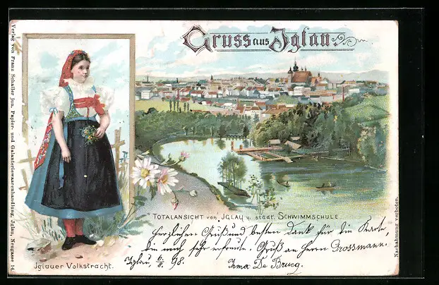 Lithographie Iglau, Totalansicht mit städt. Schwimmschule, Volkstracht