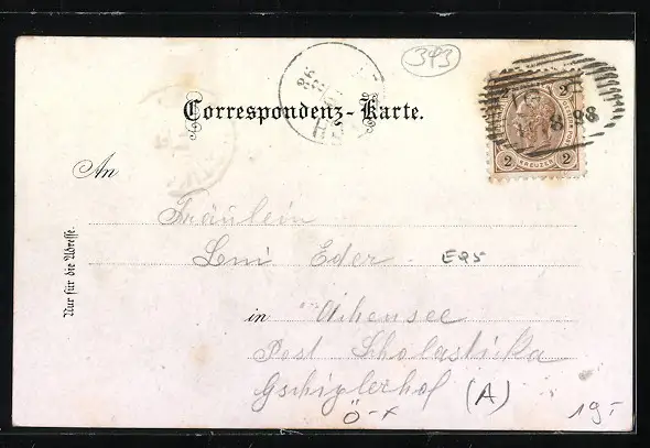 Personenbezogene Daten auf der Rückseite der Karte wurden durch blauen Textmarker unkenntlich gemacht. Die blauen Stellen sind auf die Vorderseite durchgeweicht und wirken sich negativ auf das Postkartenfoto aus
