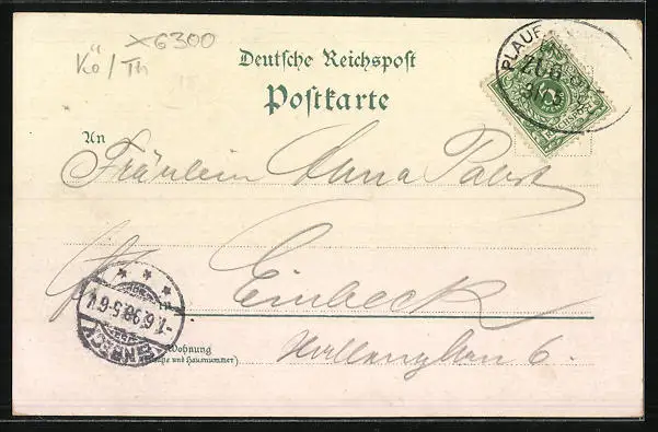 Personenbezogene Daten auf der Rückseite der Karte wurden durch blauen Textmarker unkenntlich gemacht. Die blauen Stellen sind auf die Vorderseite durchgeweicht und wirken sich negativ auf das Postkartenfoto aus
