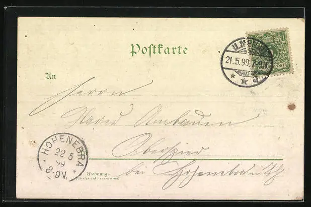 Personenbezogene Daten auf der Rückseite der Karte wurden durch blauen Textmarker unkenntlich gemacht. Die blauen Stellen sind auf die Vorderseite durchgeweicht und wirken sich negativ auf das Postkartenfoto aus