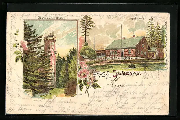 Lithographie Ilmenau, Thurm a. d. Kickelhahn, Gabelbach