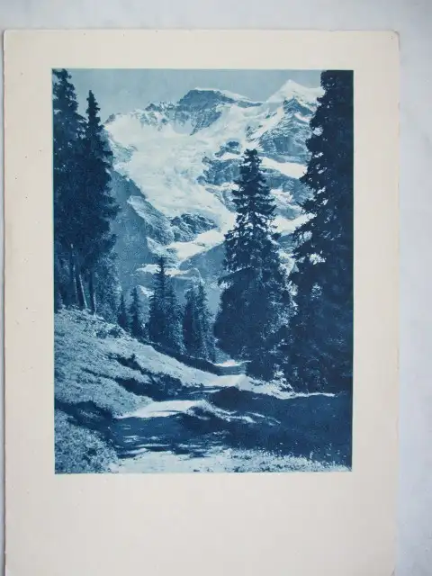 Motiv: Schneebedeckte Berge, Wald, Lichtung, Weg. Künstler: Stump. Verlagsangaben: Genf, Roto-Sadag.