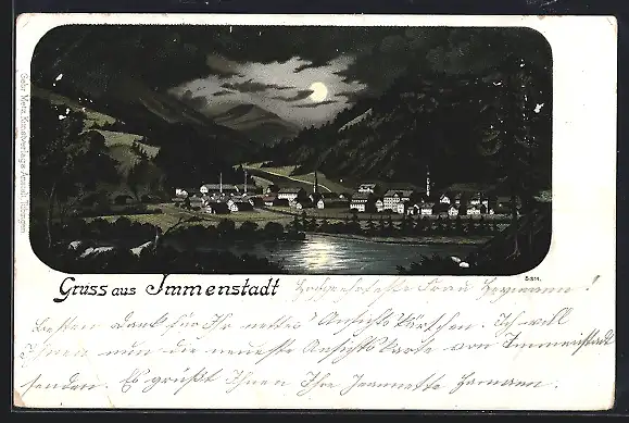 Lithographie Immenstadt, Teilansicht bei Mondschein