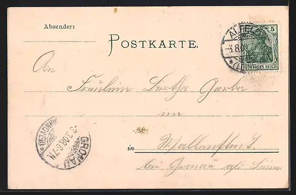 Personenbezogene Daten auf der Rückseite der Karte wurden durch blauen Textmarker unkenntlich gemacht. Die blauen Stellen sind auf die Vorderseite durchgeweicht und wirken sich negativ auf das Postkartenfoto aus