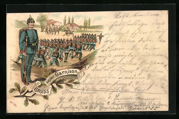 Lithographie Infanteriesoldat vor marschierender Infanterie im Kasernenhof